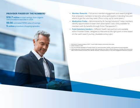 PROVIDER FINDER BY THE NUMBERS4$16.7 million in total savings from organic cost procedure searches in 2024$0.56 estimated PEPM value of savings5 million procedure shopping episodes1. McKinsey & Company analysis of 2021. Truven Health Analytics commercial claims data2. AKASA, October 4, 20223. The cost estimates displayed on Provider Finder%u00ae for various providers, facilities, and procedures are just estimates. 4. 2024 savings data is based on organic Provider Finder searches from subset of Book of Business. Excludes IFM, Government, HMO, and all members with BVA, HAS, Member Rewards, Call Requirements, or any other engagement/redirection program. %u2022 Member Rewards %u2013 Full-service member engagement and reward program that empowers members to become active participants in deciding how and where to get the care they need. (This is a buy up for some plans.)%u2022 Medication Finder %u2013 Administered by Rx Savings Solutions%u00ae, helps members identify opportunities to lower their prescription costs. (Only available for members with Rx benefits through Prime Therapeutics%u00ae.)%u2022 Point Solutions Vendors %u2013 Different health care partners are available within Provider Finder, designed to intervene at the right point in time based on the user%u2019s search journey. (Available as buy-ups.)
