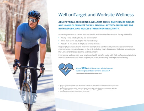 ADULTS TODAY ARE FACING A WELLNESS CRISIS. ONLY 24% OF ADULTS AGE 18 AND OLDER MEET THE U.S. PHYSICAL ACTIVITY GUIDELINES FOR BOTH AEROBIC AND MUSCLE-STRENGTHENING ACTIVITY.1 According to the most recent National Health and Nutrition Examination Survey (NHANES):%u2022 Nearly 1 in 3 adults (30.7%) are overweight.2%u2022 More than 2 in 5 adults (42.4%) have obesity.2%u2022 About 1 in 11 adults (9.2%) have severe obesity.2Regular physical activity and improved eating habits can favorably influence seven of the ten most common chronic diseases in the U.S., including heart disease and diabetes, according to the Centers for Disease Control and Prevention.4Incorporate wellness into your employee health benefits today with Well onTarget and Worksite Wellness to help reduce medical spend, increase productivity and improve well-being.Well onTarget and Worksite WellnessAbout 50% of all American adults have at least one preventable chronic disease.** Department of Health and Human Services, 20201. Physical Activity Among Adults Ages 18 and Older: United States, 2020, National Health Interview Survey, data table for figure 12. Prevalence of overweight, obesity, and severe obesity among adults aged 20 and over: United States, 1960%u20131962 through 2017%u20132018. Centers for Disease Control and Prevention. February 8, 2021. 3. Centers for Disease Control and Prevention, January 2023