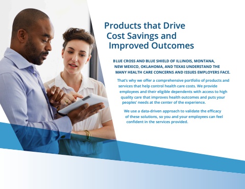 Products that Drive Cost Savings and Improved Outcomes BLUE CROSS AND BLUE SHIELD OF ILLINOIS, MONTANA, NEW MEXICO, OKLAHOMA, AND TEXAS UNDERSTAND THE MANY HEALTH CARE CONCERNS AND ISSUES EMPLOYERS FACE. That%u2019s why we offer a comprehensive portfolio of products and services that help control health care costs. We provide employees and their eligible dependents with access to high quality care that improves health outcomes and puts your peoples%u2019 needs at the center of the experience. We use a data-driven approach to validate the efficacy of these solutions, so you and your employees can feel confident in the services provided.
