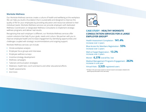 CASE STUDY - HEALTHY WORKSITE CONSULTATION SERVICES FOR A LARGE EMPLOYER GROUP*Health Assessment Completion - 141.4% increase over 2 yearsBlue Access for Members Registration - 55% increase over 2 yearsWell onTarget Registration - 13.2% increase over 2 yearsWondr - 6,378 overall lbs. lost Medical Management Programs Engagement - 262% increase in one yearVirtual Visits - 3,525 registered users* All data in this case study is based on internal research and analytics related to the specific group discussed in this case studyWorksite Wellness Our Worksite Wellness services create a culture of health and wellbeing at the workplace. We can help you build a foundation that is sustainable and designed to improve the quality of life for your employees by providing education and resources tailored to their individual needs. Worksite Wellness services can provide employers with dedicated Wellness Coordinators or designated Wellness Consultants to implement strategic wellness programs and deliver real results.Recognizing that each employer is different, our Worksite Wellness services offer custom solutions that help fit your goals, needs and culture. We partner with you to improve employee health and increase engagement by identifying opportunities and challenges coupled with strategic recommendations and ongoing support. Worksite Wellness services can include: %u2022 Onsite workplace analysis%u2022 Employee focus groups and interviews%u2022 Employee wellness surveys%u2022 Incentive strategy development %u2022 Wellness campaigns%u2022 Tailored communication strategies %u2022 Webinars, health fairs, lunch-and-learns and other educational efforts%u2022 Health assessments%u2022 And more