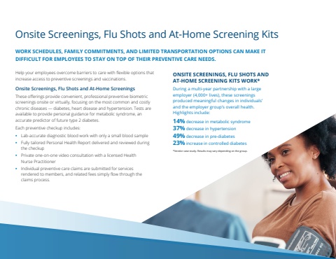WORK SCHEDULES, FAMILY COMMITMENTS, AND LIMITED TRANSPORTATION OPTIONS CAN MAKE IT DIFFICULT FOR EMPLOYEES TO STAY ON TOP OF THEIR PREVENTIVE CARE NEEDS.Help your employees overcome barriers to care with flexible options that increase access to preventive screenings and vaccinations. Onsite Screenings, Flu Shots and At-Home Screenings These offerings provide convenient, professional preventive biometric screenings onsite or virtually, focusing on the most common and costly chronic diseases %u2014 diabetes, heart disease and hypertension. Tests are available to provide personal guidance for metabolic syndrome, an accurate predictor of future type 2 diabetes.Each preventive checkup includes:%u2022 Lab-accurate diagnostic blood work with only a small blood sample%u2022 Fully tailored Personal Health Report delivered and reviewed during the checkup%u2022 Private one-on-one video consultation with a licensed Health Nurse Practitioner%u2022 Individual preventive care claims are submitted for services rendered to members, and related fees simply flow through the claims process.Onsite Screenings, Flu Shots and At-Home Screening KitsONSITE SCREENINGS, FLU SHOTS AND AT-HOME SCREENING KITS WORK*During a multi-year partnership with a large employer (4,000+ lives), these screenings produced meaningful changes in individuals%u2019 and the employer group%u2019s overall health. Highlights include:14% decrease in metabolic syndrome37% decrease in hypertension49% decrease in pre-diabetes23% increase in controlled diabetes*Vendor case study. Results may vary depending on the group.