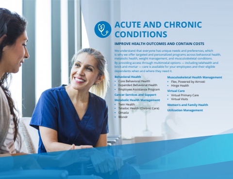 IMPROVE HEALTH OUTCOMES AND CONTAIN COSTSWe understand that everyone has unique needs and preferences, which is why we offer targeted and personalized programs across behavioral health, metabolic health, weight management, and musculoskeletal conditions. By providing access through multimodal options %u2014 including telehealth and brick-and-mortar %u2014 care is available for your employees and their eligible dependents when and where they need it.Behavioral Health%u2022 Core Behavioral Health %u2022 Expanded Behavioral Health %u2022 Employee Assistance Program Cancer Services and Support Metabolic Health Management %u2022 Twin Health %u2022 Teladoc Health (Chronic Care) %u2022 Omada%u2022 Wondr ACUTE AND CHRONIC CONDITIONSMusculoskeletal Health Management%u2022 Flex, Powered by Airrosti%u2022 Hinge HealthVirtual Care %u2022 Virtual Primary Care %u2022 Virtual Visits Women%u2019s and Family Health Utilization Management