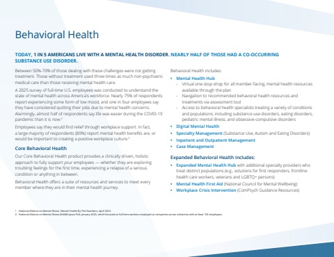 TODAY, 1 IN 5 AMERICANS LIVE WITH A MENTAL HEALTH DISORDER. NEARLY HALF OF THOSE HAD A CO-OCCURRING SUBSTANCE USE DISORDER. Between 50%-70% of those dealing with these challenges were not getting treatment. Those without treatment used three times as much non-psychiatric medical care than those receiving mental health care. A 2025 survey of full-time U.S. employees was conducted to understand the state of mental health across America%u2019s workforce. Nearly 75% of respondents report experiencing some form of low mood, and one in four employees say they have considered quitting their jobs due to mental health concerns. Alarmingly, almost half of respondents say life was easier during the COVID-19 pandemic than it is now.2 Employees say they would find relief through workplace support. In fact, a large majority of respondents (80%) report mental health benefits are, or would be important to creating a positive workplace culture.2Core Behavioral Health Our Core Behavioral Health product provides a clinically driven, holistic approach to fully support your employees %u2014 whether they are exploring troubling feelings for the first time, experiencing a relapse of a serious condition or anything in between.Behavioral Health offers a suite of resources and services to meet every member where they are in their mental health journey. Behavioral Health includes:%u2022 Mental Health Hub- Virtual one-stop-shop for all member-facing, mental health resources available through the plan - Navigation to recommended behavioral health resources and treatments via assessment tool - Access to behavioral health specialists treating a variety of conditions and populations, including substance use disorders, eating disorders, pediatric mental illness, and obsessive-compulsive disorders %u2022 Digital Mental Health %u2022 Specialty Management (Substance Use, Autism and Eating Disorders)%u2022 Inpatient and Outpatient Management%u2022 Case ManagementExpanded Behavioral Health includes: %u2022 Expanded Mental Health Hub with additional specialty providers who treat distinct populations (e.g., solutions for first responders, frontline health care workers, veterans and LGBTQ+ persons) %u2022 Mental Health First Aid (National Council for Mental Wellbeing)%u2022 Workplace Crisis Intervention (ComPsych Guidance Resources)Behavioral Health1. National Alliance on Mental Illness, Mental Health By The Numbers, April 20232. National Alliance on Mental Illness (NAMI)-Ipsos Poll, January 2025, which focused on full-time workers employed at companies across industries with at least 100 employees