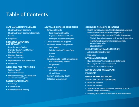 Table of ContentsACUTE AND CHRONIC CONDITIONS%u2022 Behavioral Health- Core Behavioral Health - Expanded Behavioral Health - Employee Assistance Program%u2022 Cancer Services and Support%u2022 Metabolic Health Management- Twin Health - Teladoc Health (Chronic Care) - Omada - Wondr %u2022 Musculoskeletal Health Management - Flex, Powered by Airrosti - Hinge Health %u2022 Virtual Care - Virtual Primary Care - Virtual Visits %u2022 Women%u2019s and Family Health%u2022 Utilization ManagementCARE MANAGEMENT PACKAGES%u2022 Health Advocacy Solutions%u2022 Health Advocacy Solutions Essentials%u2022 Enable%u2022 Empower+CONSUMER EDUCATION AND REWARDS%u2022 Benefits Value Advisor%u2022 Provider Finder%u00ae and Member Liability Estimator %u2022 Member Rewards %u2022 Medication Finder %u2022 Digital Member Hub from Evive %u2022 IncentivesWELLBEING AND PREVENTION%u2022 Well onTarget%u00ae%u2022 Worksite Wellness%u2022 Onsite Screenings, Flu Shots andAt-Home Screening KitsGUIDED HEALTH PLANS%u2022 CareWaySM%u2022 Coupe Health%u2022 Reference Based PricingCONSUMER FINANCIAL SOLUTIONS %u2022 Health Savings Accounts, Flexible Spending Accounts and Health Reimbursement Arrangements- Health Savings Account with Vendor Integration - Flexible Spending Account with Vendor Integration- Health Reimbursement Arrangement with Vendor Integration- BlueEdge HCASMEMPLOYER FINANCIAL PROTECTION %u2022 Advanced Payment Review %u2022 Stop Loss NATIONAL NETWORKS %u2022 Blue Distinction%u00ae Centers Benefit Differential %u2022 Blue High Performance Network%u00ae%u2022 Total Care Benefit Differential MyVIRTUALCARE ACCESS PLANPHARMACYGROUP RETIREE SOLUTIONSANCILLARY HEALTH SOLUTIONS%u2022 BlueCare DentalSM%u2022 BlueCare VisionSM%u2022 Supplemental Health Insurance: Accident, Critical Illness, Hospital Indemnity%u2022 Disability and Absence (Short-Term and Long-Term)