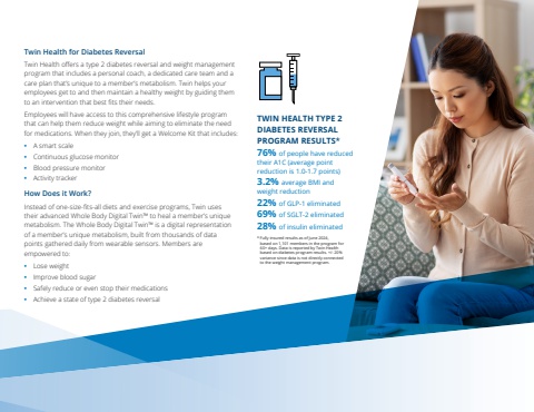 Twin Health for Diabetes Reversal Twin Health offers a type 2 diabetes reversal and weight management program that includes a personal coach, a dedicated care team and a care plan that%u2019s unique to a member%u2019s metabolism. Twin helps your employees get to and then maintain a healthy weight by guiding them to an intervention that best fits their needs.Employees will have access to this comprehensive lifestyle program that can help them reduce weight while aiming to eliminate the need for medications. When they join, they%u2019ll get a Welcome Kit that includes: %u2022 A smart scale %u2022 Continuous glucose monitor %u2022 Blood pressure monitor %u2022 Activity trackerHow Does it Work? Instead of one-size-fits-all diets and exercise programs, Twin uses their advanced Whole Body Digital Twin%u2122 to heal a member%u2019s unique metabolism. The Whole Body Digital Twin%u2122 is a digital representation of a member%u2019s unique metabolism, built from thousands of data points gathered daily from wearable sensors. Members are empowered to: %u2022 Lose weight %u2022 Improve blood sugar %u2022 Safely reduce or even stop their medications %u2022 Achieve a state of type 2 diabetes reversalTWIN HEALTH TYPE 2 DIABETES REVERSAL PROGRAM RESULTS*76% of people have reduced their A1C (average point reduction is 1.0-1.7 points)3.2% average BMI and weight reduction22% of GLP-1 eliminated69% of SGLT-2 eliminated28% of insulin eliminated* Fully insured results as of June 2024, based on 1,101 members in the program for 60+ days. Data is reported by Twin Health based on diabetes program results. +/- 20% variance since data is not directly connected to the weight management program.