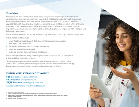 Virtual Visits Employees and their families often need access to a provider outside typical office hours for conditions that don%u2019t warrant emergency care. In fact, $38 billion is wasted annually in overused emergency departments1 each year. Virtual Visits, powered by MDLIVE%u00ae, are a more efficient approach to health care, providing employees access to board-certified providers where and when they need it. With access through mobile app, online video, or phone, and at a lower cost than in-person visits, virtual visits are a convenient, cost-effective option for employees%u2019 non-emergent and behavioral health needs.Virtual Visits increases access to care while reducing health care costs for you and your employees.Virtual Visits benefits include:%u2022 Lower health care cost through deflecting unnecessary emergency roomand urgent care center visits%u2022 Decreased absenteeism and increased productivity%u2022 Improved access in remote areas%u2022 Improved member convenience and satisfaction.Virtual Visits provides the ability for employees to see a physician 24/7 or therapist at a time and place convenient to them. Simple, non-emergency medical, pediatric and behavioral health conditions can be addressed via MDLIVE%u2019s platform using telephone, live chat, online video or mobile app.2Digital prescriptions can be sent to the member%u2019s pharmacy of choice.VIRTUAL VISITS AVERAGE COST SAVINGS3$68 less than an in-person PCP visit$123 less than an urgent care visit$1,783 less than an emergency room visitAverage wait time for a virtual visit: 8 minutes41. New England Healthcare Institute2. Service availability and communication mode dependent upon member%u2019s location at time of service.3. Blue Cross and Blue Shield of Illinois, Montana, New Mexico, Oklahoma and Texas Analytics Team, February 2025; savings based on allowed amounts4. Based on MDLIVE consultations, 2024