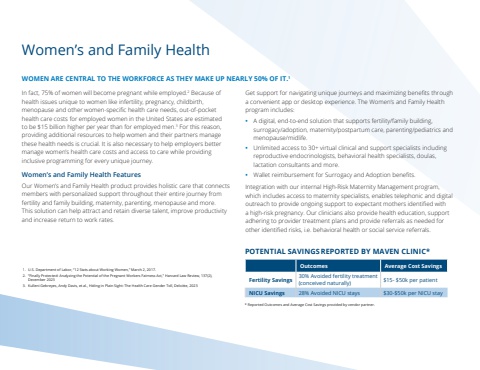 Women%u2019s and Family HealthPOTENTIAL SAVINGS REPORTED BY MAVEN CLINIC*Outcomes Average Cost SavingsFertility Savings 30% Avoided fertility treatment (conceived naturally) $15- $50k per patientNICU Savings 28% Avoided NICU stays $30-$50k per NICU stay* Reported Outcomes and Average Cost Savings provided by vendor partner.1. U.S. Department of Labor, %u201c12 Stats about Working Women,%u201d March 2, 2017. 2. %u201cFinally Protected: Analyzing the Potential of the Pregnant Workers Fairness Act,%u201d Harvard Law Review, 137(2), December 20233. Kulleni Gebreyes, Andy Davis, et al., Hiding in Plain Sight: The Health Care Gender Toll, Deloitte, 2023WOMEN ARE CENTRAL TO THE WORKFORCE AS THEY MAKE UP NEARLY 50% OF IT.1In fact, 75% of women will become pregnant while employed.2 Because of health issues unique to women like infertility, pregnancy, childbirth, menopause and other women-specific health care needs, out-of-pocket health care costs for employed women in the United States are estimated to be $15 billion higher per year than for employed men.3 For this reason, providing additional resources to help women and their partners manage these health needs is crucial. It is also necessary to help employers better manage women%u2019s health care costs and access to care while providing inclusive programming for every unique journey.Women%u2019s and Family Health FeaturesOur Women%u2019s and Family Health product provides holistic care that connects members with personalized support throughout their entire journey from fertility and family building, maternity, parenting, menopause and more. This solution can help attract and retain diverse talent, improve productivity and increase return to work rates. Get support for navigating unique journeys and maximizing benefits through a convenient app or desktop experience. The Women%u2019s and Family Health program includes:%u2022 A digital, end-to-end solution that supports fertility/family building, surrogacy/adoption, maternity/postpartum care, parenting/pediatrics and menopause/midlife.%u2022 Unlimited access to 30+ virtual clinical and support specialists including reproductive endocrinologists, behavioral health specialists, doulas, lactation consultants and more. %u2022 Wallet reimbursement for Surrogacy and Adoption benefits. Integration with our internal High-Risk Maternity Management program, which includes access to maternity specialists, enables telephonic and digital outreach to provide ongoing support to expectant mothers identified with a high-risk pregnancy. Our clinicians also provide health education, support adhering to provider treatment plans and provide referrals as needed for other identified risks, i.e. behavioral health or social service referrals.