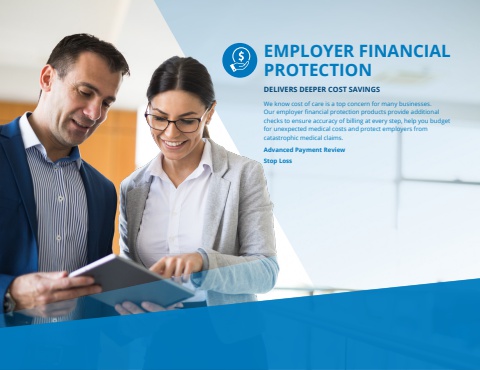 EMPLOYER FINANCIAL PROTECTION DELIVERS DEEPER COST SAVINGSWe know cost of care is a top concern for many businesses. Our employer financial protection products provide additional checks to ensure accuracy of billing at every step, help you budget for unexpected medical costs and protect employers from catastrophic medical claims.Advanced Payment ReviewStop Loss