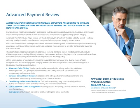 AS MEDICAL SPEND CONTINUES TO INCREASE, EMPLOYERS ARE LOOKING TO MITIGATE THESE COSTS THROUGH MORE EXPANSIVE CLAIM REVIEWS THAT DETECT WASTE IN THE HEALTH CARE SYSTEM. Complexities in health care regulatory policies and coding practices, rapidly evolving technologies, and interest in streamlining reimbursement all drive the need for a comprehensive approach to payment integrity.Advanced Payment Review helps ensure self-funded employers proactively mitigate wasteful spend %u2014 without reducing quality of care for members %u2014 through our holistic payment integrity enhancement. APR%u2019s multifaceted claims review process blends advanced technology with skilled human capital to better identify anomalous coding and billing trends and create sustained improvements to provider behavior at a lower fee than competitors. This sophisticated approach proactively addresses evolving client and market needs to continually reduce ASO employer spend and significantly enhances claim reviews and reporting beyond the foundational capabilities to maximize client savings realization in a transparent and meaningful way.APR is a compilation of specialized reviews that target billing errors based on a diverse range of claim categories. Our end-to-end payment integrity reviews take a multi-layered and comprehensive approach to reducing medical spend, including:%u2022 Advanced Claim Editing: Vendor-performed automated claim editing and coding validation adhering to AMA, CMS, plan policies/procedures and coding standards performed both prospectively and retrospectively%u2022 Complex Clinical Claim Reviews: Prospective and retrospective forensic high-dollar and DRG claim reviews and audits by experts using patient medical records%u2022 Data Mining and Advanced Analytics: Enriched data mining using customized algorithms that review historical claims to further identify and recover overpayments %u2022 Out-of-Network Claims Management: Rate negotiation and pricing services for out-of-network, out-of-state claims%u2022 Subrogation: Ensure claim payouts by another liable party occur seamlesslyAdvanced Payment Review APR%u2019S 2024 BOOK-OF-BUSINESS AVERAGE SAVINGS$8.8%u2013$22.34 PEPM(on allowed and paid dollars)** Note that employer savings can drastically vary due to various factors such as an employer%u2019s particular demographics
