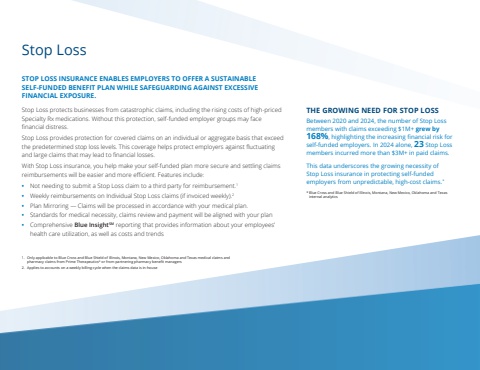 STOP LOSS INSURANCE ENABLES EMPLOYERS TO OFFER A SUSTAINABLE SELF-FUNDED BENEFIT PLAN WHILE SAFEGUARDING AGAINST EXCESSIVE FINANCIAL EXPOSURE. Stop Loss protects businesses from catastrophic claims, including the rising costs of high-priced Specialty Rx medications. Without this protection, self-funded employer groups may face financial distress.Stop Loss provides protection for covered claims on an individual or aggregate basis that exceed the predetermined stop loss levels. This coverage helps protect employers against fluctuating and large claims that may lead to financial losses. With Stop Loss insurance, you help make your self-funded plan more secure and settling claims reimbursements will be easier and more efficient. Features include:%u2022 Not needing to submit a Stop Loss claim to a third party for reimbursement.1%u2022 Weekly reimbursements on Individual Stop Loss claims (if invoiced weekly).2%u2022 Plan Mirroring %u2014 Claims will be processed in accordance with your medical plan. %u2022 Standards for medical necessity, claims review and payment will be aligned with your plan%u2022 Comprehensive Blue InsightSM reporting that provides information about your employees%u2019 health care utilization, as well as costs and trends Stop Loss THE GROWING NEED FOR STOP LOSSBetween 2020 and 2024, the number of Stop Loss members with claims exceeding $1M+ grew by168%, highlighting the increasing financial risk for self-funded employers. In 2024 alone, 23 Stop Loss members incurred more than $3M+ in paid claims. This data underscores the growing necessity of Stop Loss insurance in protecting self-funded employers from unpredictable, high-cost claims.* * Blue Cross and Blue Shield of Illinois, Montana, New Mexico, Oklahoma and Texas internal analytics1. Only applicable to Blue Cross and Blue Shield of Illinois, Montana, New Mexico, Oklahoma and Texas medical claims and pharmacy claims from Prime Therapeutics%u00ae or from partnering pharmacy benefit managers 2. Applies to accounts on a weekly billing cycle when the claims data is in-house