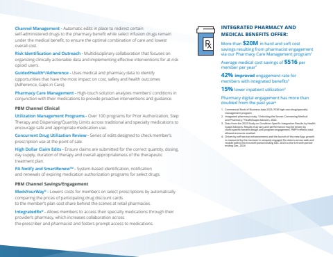 Channel Management - Automatic edits in place to redirect certain self-administered drugs to the pharmacy benefit while select infusion drugs remain under the medical benefit, to ensure the optimal combination of care and lowest overall cost.Risk Identification and Outreach - Multidisciplinary collaboration that focuses on organizing clinically actionable data and implementing effective interventions for at-risk opioid users.GuidedHealth%u00ae/Adherence - Uses medical and pharmacy data to identify opportunities that have the most impact on cost, safety and health outcomes (Adherence, Gaps in Care).Pharmacy Care Management - High-touch solution analyzes members%u2019 conditions in conjunction with their medications to provide proactive interventions and guidance.PBM Channel ClinicalUtilization Management Programs - Over 100 programs for Prior Authorization, Step Therapy and Dispensing/Quantity Limits across traditional and specialty medications to encourage safe and appropriate medication use.Concurrent Drug Utilization Review - Series of edits designed to check member%u2019s prescription use at the point of sale.High Dollar Claim Edits - Ensure claims are submitted for the correct quantity, dosing, day supply, duration of therapy and overall appropriateness of the therapeutic treatment plan.PA Notify and SmartRenewTM - System-based identification, notification and renewals of expiring medication authorization programs for select drugs.PBM Channel Savings/EngagementMedsYourWay%u00ae - Lowers costs for members on select prescriptions by automatically comparing the prices of participating drug discount cards to the member%u2019s plan cost share behind the scenes at retail pharmacies.IntegratedRx%u00ae - Allows members to access their specialty medications through their provider%u2019s pharmacy, which increases collaboration across the prescriber and pharmacist and fosters prompt access to medications.INTEGRATED PHARMACY AND MEDICAL BENEFITS OFFER:More than $20M in hard and soft cost savings resulting from pharmacist engagement via our Pharmacy Care Management program1Average medical cost savings of $516 per member per year242% improved engagement rate for members with integrated benefits315% lower inpatient utilization3Pharmacy digital engagement has more than doubled from the past year41. Commercial Book of Business data 2023, PCM high-cost drug/specialty management program. 2. Integrated pharmacy study, %u201cUnlocking the Secret: Connecting Medical and Pharmacy,%u201d HealthScape Advisors, 2022. 3. Data from the 2023 Study on Condition-Specific Integration Results by Health Scape Advisors. Results may vary and performance may be driven by client-specific benefit design and program engagement. PMPY reflects total allowed amounts studied.4. Driven by self service enhancements and the launch of the new App; growth is measured by the increase in uniquely engaged Rx visitors across web and mobile within the 6-month period ending Dec. 2023 to the 6-month period ending Dec. 2024