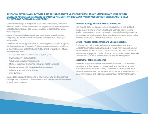OPERATING NATIONALLY, BUT WITH DEEP CONNECTIONS TO LOCAL PROVIDERS, GROUP RETIREE SOLUTIONS PROVIDES MEDICARE ADVANTAGE, MEDICARE ADVANTAGE PRESCRIPTION DRUG AND PART D PRESCRIPTION DRUG PLANS TO MEET THE NEEDS OF EMPLOYERS AND RETIREES. Our deep knowledge of the private, public and union sectors, along with Medicare, allows our teams to develop strong partnerships with employers and retirees and provide best-in-class solutions to address their unique health objectives. As one of the nation%u2019s largest and most experienced health insurance companies, we are a trusted market leader among retirees, employers and providers.Our Medicare Advantage and Medicare Advantage Prescription Drug plans are designed to meet the needs of unique retiree populations. In addition to covering benefits under Medicare Parts A and B, Group Retiree MA and MAPD plans provide:%u2022 Dental, vision and hearing services as a plan option%u2022 SilverSneakers%u00ae Fitness Program%u2022 Virtual visits, including mental health %u2022 Member incentives program to encourage healthy activities%u2022 Discount program with thousands of savings options%u2022 In-home assessment by a clinician %u2022 24/7 NurselineOur dedicated account team works to help retirees who are transitioning coverage. Our unique and customized service model helps avoid disruptions to service and coverage.Financial Savings Through Product Innovation Fully insured plans are tailored to meet employer needs with a robustclinical model to improve retiree health and wellness. Market-leading product innovation and expert consultation around plan design maximize the employer%u2019s overall program. Streamlined implementation by our highly skilled team ensures a smooth transition to a new plan. Strong Provider Relationships and Clinical Expertise Our broad national provider and pharmacy networks ensure access. Long-standing relationships with providers reduce retiree disruption and create avenues for best-in-class, value-based care. Our clinical expertise and member engagement model minimize disruption for retirees. We make it our mission to provide health care that treats the whole person. Exceptional Retiree Experience The expert support retirees receive allows them to feel confident about transitioning to their new group retiree Medicare plan. We understand that retiree communications are key, so we invest in member outreach and education initiatives. Our dedicated customer service team focuses on group retiree needs and addresses questions and concerns thoroughly.