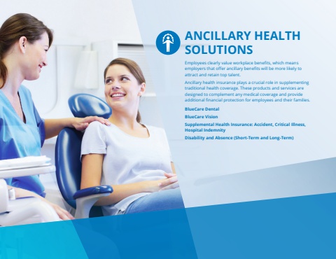 ANCILLARY HEALTH SOLUTIONSEmployees clearly value workplace benefits, which means employers that offer ancillary benefits will be more likely to attract and retain top talent. Ancillary health insurance plays a crucial role in supplementing traditional health coverage. These products and services are designed to complement any medical coverage and provide additional financial protection for employees and their families.BlueCare DentalBlueCare VisionSupplemental Health Insurance: Accident, Critical Illness, Hospital IndemnityDisability and Absence (Short-Term and Long-Term)