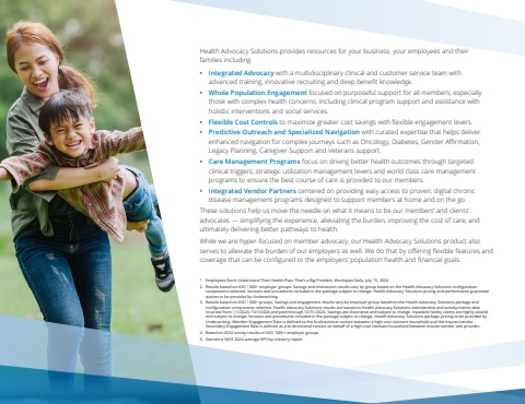 Health Advocacy Solutions provides resources for your business, your employees and their families including:%u2022 Integrated Advocacy with a multidisciplinary clinical and customer service team with advanced training, innovative recruiting and deep benefit knowledge.%u2022 Whole Population Engagement focused on purposeful support for all members, especially those with complex health concerns, including clinical program support and assistance with holistic interventions and social services.%u2022 Flexible Cost Controls to maximize greater cost savings with flexible engagement levers.%u2022 Predictive Outreach and Specialized Navigation with curated expertise that helps deliver enhanced navigation for complex journeys such as Oncology, Diabetes, Gender Affirmation, Legacy Planning, Caregiver Support and Veterans support.%u2022 Care Management Programs focus on driving better health outcomes through targeted clinical triggers, strategic utilization management levers and world class care management programs to ensure the best course of care is provided to our members.%u2022 Integrated Vendor Partners centered on providing easy access to proven, digital chronic disease management programs designed to support members at home and on the go.These solutions help us move the needle on what it means to be our members%u2019 and clients%u2019 advocates %u2014 simplifying the experience, alleviating the burden, improving the cost of care, and ultimately delivering better pathways to health. While we are hyper-focused on member advocacy, our Health Advocacy Solutions product also serves to alleviate the burden of our employers as well. We do that by offering flexible features and coverage that can be configured to the employers%u2019 population health and financial goals.1. Employees Don%u2019t Understand Their Health Plan: That%u2019s a Big Problem, Workspan Daily, July 15, 2024 2. Results based on ASO 1000+ employer groups. Savings and interaction results vary by group based on the Health Advocacy Solutions configuration components selected. Services and procedures included in the package subject to change. Health Advocacy Solutions pricing and performance guarantee quotes to be provided by Underwriting.3. Results based on ASO 1000+ groups. Savings and engagement results vary by employer group based on the Health Advocacy Solutions package and configuration components selected. Health Advocacy Solutions results are based on Health Advocacy Solutions membership and activity/claims data incurred from 1/1/2024%u201310/1/2024 and paid through 12/31/2024. Savings are illustrative and subject to change. Inpatient facility claims are highly volatile and subject to change. Services and procedures included in the package subject to change. Health Advocacy Solutions package pricing to be provided by Underwriting. Member Engagement Rate is defined as the bi-directional contact between a high-cost claimant household and the insurer/vendor. Secondary Engagement Rate is defined as a bi-directional contact on behalf of a high-cost claimant household between insurer/vendor and provider.4. Based on 2024 survey results of ASO 1000+ employer groups 5. Satmetrix NICE 2024 average NPS by industry report