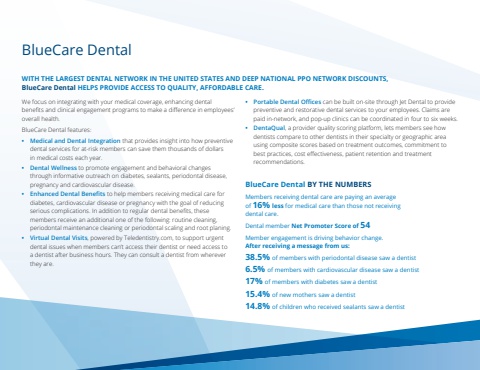 WITH THE LARGEST DENTAL NETWORK IN THE UNITED STATES AND DEEP NATIONAL PPO NETWORK DISCOUNTS, BlueCare Dental HELPS PROVIDE ACCESS TO QUALITY, AFFORDABLE CARE. We focus on integrating with your medical coverage, enhancing dental benefits and clinical engagement programs to make a difference in employees%u2019 overall health.BlueCare Dental features:%u2022 Medical and Dental Integration that provides insight into how preventive dental services for at-risk members can save them thousands of dollarsin medical costs each year. %u2022 Dental Wellness to promote engagement and behavioral changes through informative outreach on diabetes, sealants, periodontal disease, pregnancy and cardiovascular disease. %u2022 Enhanced Dental Benefits to help members receiving medical care for diabetes, cardiovascular disease or pregnancy with the goal of reducing serious complications. In addition to regular dental benefits, these members receive an additional one of the following: routine cleaning, periodontal maintenance cleaning or periodontal scaling and root planing. %u2022 Virtual Dental Visits, powered by Teledentistry.com, to support urgent dental issues when members can%u2019t access their dentist or need access to a dentist after business hours. They can consult a dentist from wherever they are. %u2022 Portable Dental Offices can be built on-site through Jet Dental to provide preventive and restorative dental services to your employees. Claims are paid in-network, and pop-up clinics can be coordinated in four to six weeks. %u2022 DentaQual, a provider quality scoring platform, lets members see how dentists compare to other dentists in their specialty or geographic area using composite scores based on treatment outcomes, commitment to best practices, cost effectiveness, patient retention and treatment recommendations. BlueCare DentalBlueCare Dental BY THE NUMBERSMembers receiving dental care are paying an average of 16% less for medical care than those not receiving dental care. Dental member Net Promoter Score of 54 Member engagement is driving behavior change. After receiving a message from us:38.5% of members with periodontal disease saw a dentist6.5% of members with cardiovascular disease saw a dentist17% of members with diabetes saw a dentist15.4% of new mothers saw a dentist14.8% of children who received sealants saw a dentist