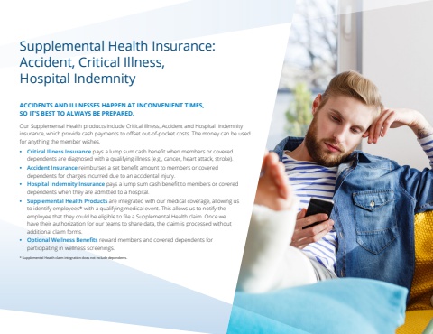 Supplemental Health Insurance: Accident, Critical Illness, Hospital IndemnityACCIDENTS AND ILLNESSES HAPPEN AT INCONVENIENT TIMES, SO IT%u2019S BEST TO ALWAYS BE PREPARED. Our Supplemental Health products include Critical Illness, Accident and Hospital Indemnity insurance, which provide cash payments to offset out-of-pocket costs. The money can be used for anything the member wishes. %u2022 Critical Illness Insurance pays a lump sum cash benefit when members or covered dependents are diagnosed with a qualifying illness (e.g., cancer, heart attack, stroke).%u2022 Accident Insurance reimburses a set benefit amount to members or covered dependents for charges incurred due to an accidental injury.%u2022 Hospital Indemnity Insurance pays a lump sum cash benefit to members or covered dependents when they are admitted to a hospital.%u2022 Supplemental Health Products are integrated with our medical coverage, allowing us to identify employees* with a qualifying medical event. This allows us to notify the employee that they could be eligible to file a Supplemental Health claim. Once we have their authorization for our teams to share data, the claim is processed without additional claim forms.%u2022 Optional Wellness Benefits reward members and covered dependents for participating in wellness screenings.* Supplemental Health claim integration does not include dependents.