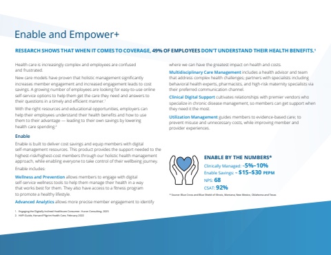 RESEARCH SHOWS THAT WHEN IT COMES TO COVERAGE, 49% OF EMPLOYEES DON%u2019T UNDERSTAND THEIR HEALTH BENEFITS.1Health care is increasingly complex and employees are confused and frustrated. New care models have proven that holistic management significantly increases member engagement and increased engagement leads to cost savings. A growing number of employees are looking for easy-to-use online self-service options to help them get the care they need and answers totheir questions in a timely and efficient manner.1With the right resources and educational opportunities, employers can help their employees understand their health benefits and how to use them to their advantage %u2014 leading to their own savings by lowering health care spending.2Enable Enable is built to deliver cost savings and equip members with digital self-management resources. This product provides the support needed to the highest-risk/highest-cost members through our holistic health management approach, while enabling everyone to take control of their wellbeing journey.Enable includes:Wellness and Prevention allows members to engage with digital self-service wellness tools to help them manage their health in a way that works best for them. They also have access to a fitness program to promote a healthy lifestyle.Advanced Analytics allows more precise member engagement to identify where we can have the greatest impact on health and costs. Multidisciplinary Care Management includes a health advisor and team that address complex health challenges; partners with specialists including behavioral health experts, pharmacists, and high-risk maternity specialists via their preferred communication channel.Clinical Digital Support cultivates relationships with premier vendors who specialize in chronic disease management, so members can get support when they need it the most.Utilization Management guides members to evidence-based care; to prevent misuse and unnecessary costs, while improving member and provider experiences.Enable and Empower+1. Engaging the Digitally Inclined Healthcare Consumer. Huron Consulting. 2025 2. HAPi Guide, Harvard Pilgrim Health Care, February 2022 ENABLE BY THE NUMBERS*Clinically Managed: ~5%%u201310%Enable Savings: ~ $15%u2013$30 PEPM NPS: 68CSAT: 92%* Source: Blue Cross and Blue Shield of Illinois, Montana, New Mexico, Oklahoma and Texas