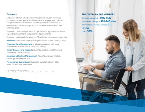 EMPOWER+ BY THE NUMBERS2Clinically Managed: ~10%-15%Empower+ Savings: ~ $20-$40 PEPM ROI Performance Guarantees: 2:1NPS: 69CSAT: 92%Empower+ Empower+ offers a robust health management solution delivering increased cost savings and additional member engagement channels. This product helps all members to leverage wellness resources as needed and provides stronger support to help members reach their wellbeing goals.Empower+ offers the right blend of high-tech and high-touch, as well as expanded interventions and guaranteed performance. Empower+ includes all the features of Enable (see the previous page), plus:Incentives to motivate employees to get involved in their health journey.Expanded Care Management to a larger population with more interventions than Enable for faster cost savings.Cancer Services and Support providing proactive outreach during a member%u2019s cancer journey.1Expanded Utilization Management including advanced imaging, cardiology and sleep services.Performance Guarantees including an outreach rate of > 95% and a 2:1 return on investment.1. In states where program is available.2. Source: Blue Cross and Blue Shield of Illinois, Montana, New Mexico, Oklahoma and Texas